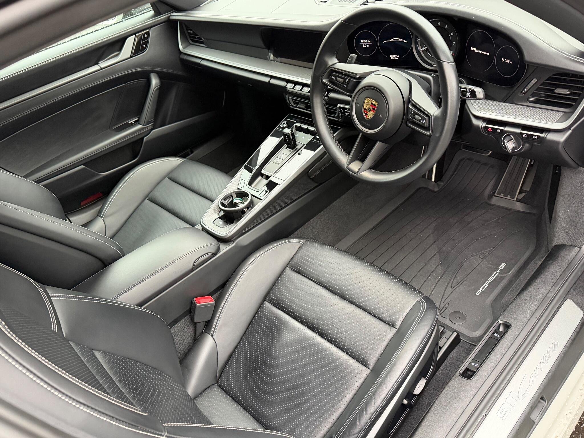 This 2020 Porsche 911 T 992 Carrera presents with exceptionally low mileage for its year, having covered just 8500 miles. This Euro 6 compliant model boasts a 3.0 litre petrol engine and comes with a full dealership service history, ensuring its provenance is impeccable. For your peace of mind, a 12 month MOT will be provided upon purchase. Notable features include a heated multifunction GT sports steering wheel with a matt carbon panel, front and rear ParkAssist with a reversing camera, and striking black sports tailpipes. The vehicle is further enhanced by 20 inch front and 21 inch rear Carrera S alloy wheels, and heated front seats for added comfort.